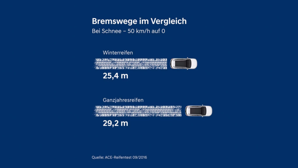 - Ganzjahresreifen sind immer nur ein Kompromiss. Sie reichen im Winter und Sommer nicht an die Leistungen von saisonalen Reifen heran. In Extremsituationen fallen ihre Bremswege deutlich länger aus.