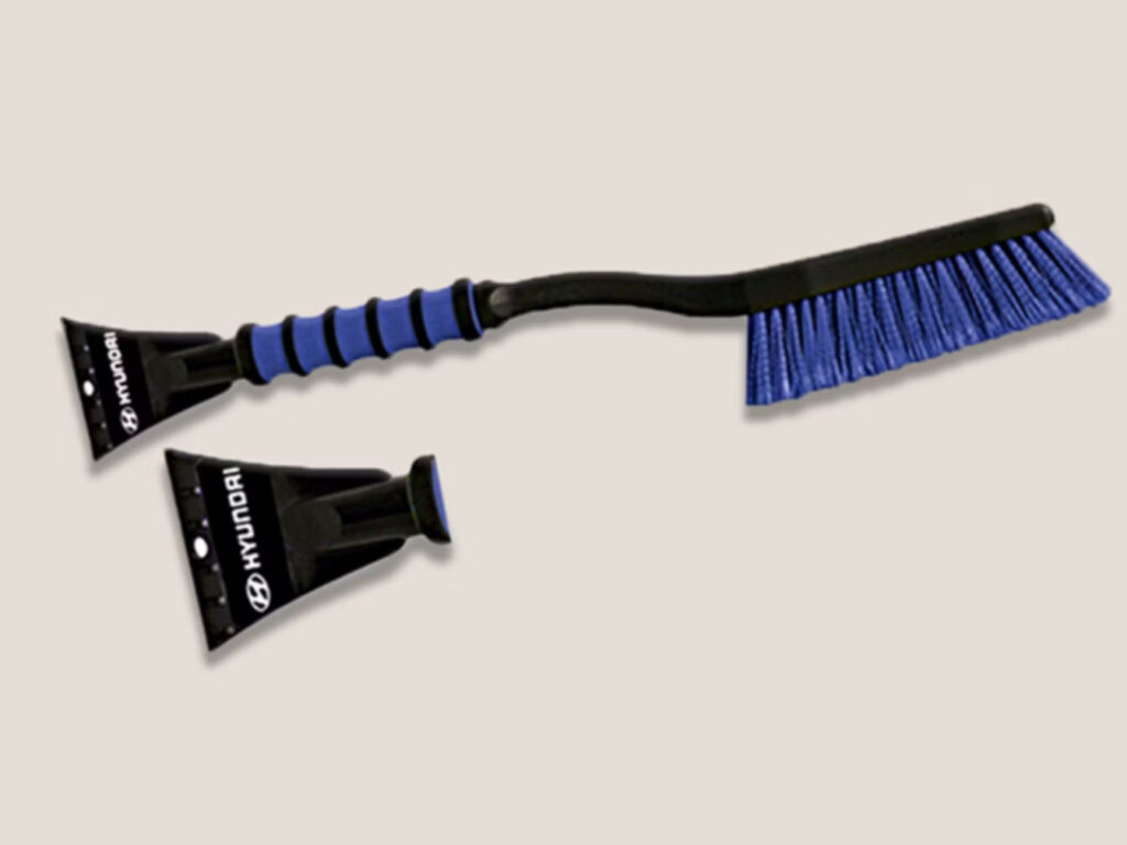 Dieser Eiskratzer gehört in jeden Hyundai: Als 2-in-1-Werkzeug mit langem, rutschfestem Griff und lackschonenden Borsten enteist er auch große Scheiben einfach und effizient.